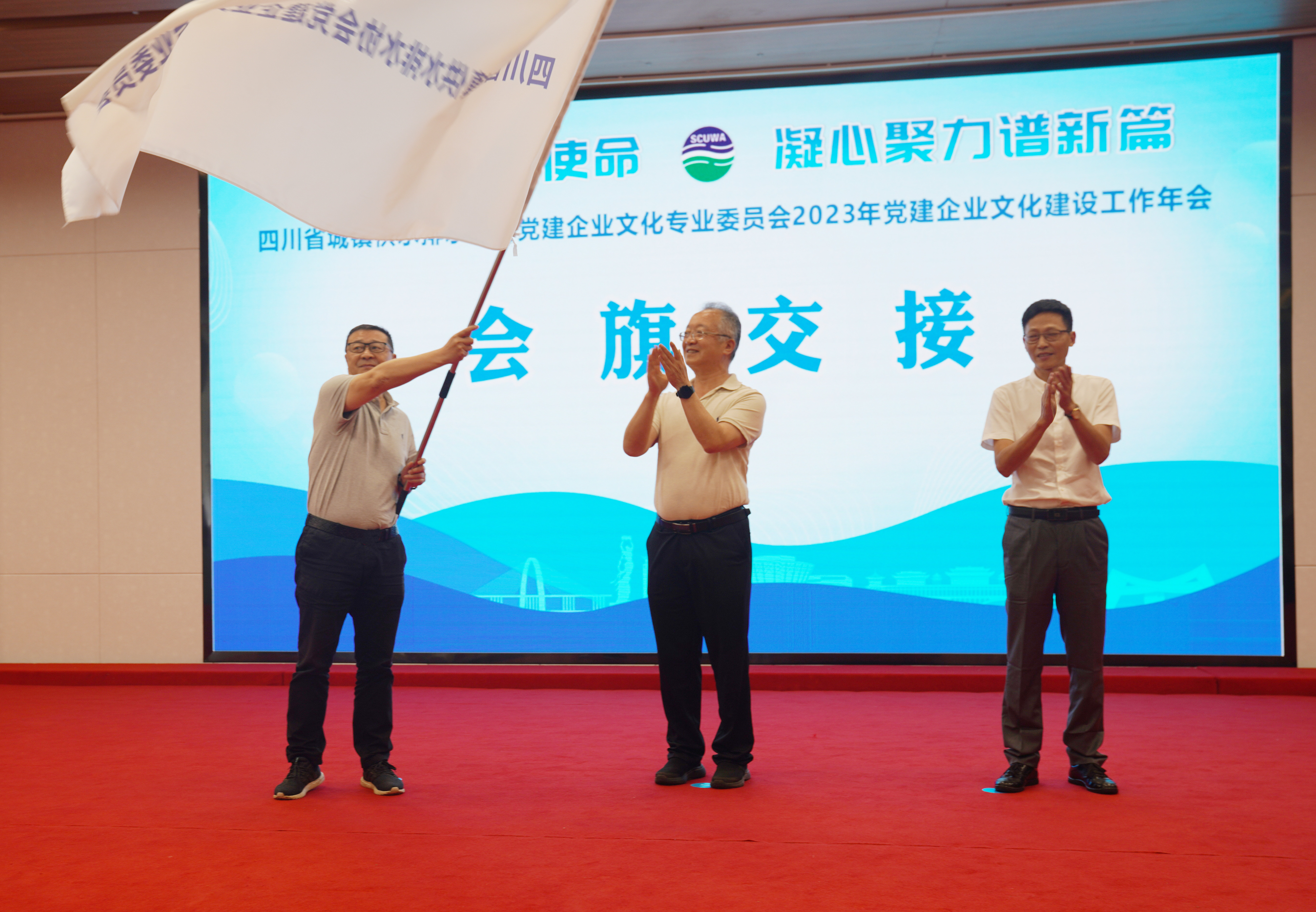 同期,進(jìn)行了“2024黨建企業(yè)文化建設(shè)工作年會”承辦方會旗交接儀式,儀式由省水協(xié)黨支部書記、常務(wù)副秘書長紀(jì)勝軍主持,雅安市供排水有限責(zé)任公司總經(jīng)理甘寧和達(dá)州水務(wù)集團資深經(jīng)理李潮分別代表本屆和下一屆承辦方完成會旗交接。李潮表示,舉辦黨建企業(yè)文化建設(shè)工作年會是加強行業(yè)企業(yè)文化交流、拓寬思路、創(chuàng)新發(fā)展的一次良好機會,達(dá)州水務(wù)集團有信心在省水協(xié)的指導(dǎo)下,把下屆年會辦成一次有質(zhì)量、有特色、有亮點的盛會,歡迎行業(yè)同仁光臨達(dá)州!