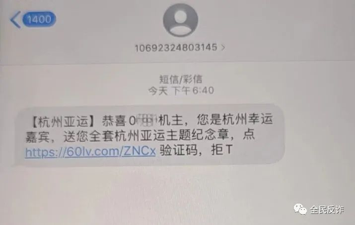近日,朱女士回家路上,接到一個(gè)電話,對(duì)方那頭傳來(lái)溫柔磁性的男聲提醒她,說(shuō)有一條短信記得查收,朱女士點(diǎn)開(kāi)一看,短信顯示:“【杭州亞運(yùn)】恭喜****機(jī)主,您是杭州幸運(yùn)嘉賓,送您全套杭州亞運(yùn)主題紀(jì)念章,點(diǎn)http://60lv.com/ZNCx驗(yàn)證碼,拒T ”。