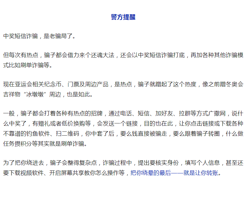 看到中獎(jiǎng)短信,朱女士雖然很開(kāi)心,但她沒(méi)有急著去點(diǎn)短信上的鏈接,冷靜下來(lái)一想,像這種亞運(yùn)紀(jì)念幣非常熱門,身邊很多朋友在網(wǎng)上預(yù)約購(gòu)買都買不到,現(xiàn)在免費(fèi)領(lǐng)取,還是全套,有這么好的事情嗎?朱女士覺(jué)得自己可能遇到了騙子,報(bào)了警。