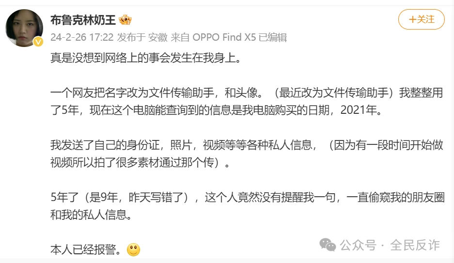 從其表述中得知:2021年開始,就用手機給微信里的“文件傳輸助手”傳資料,包括身份證信息和各種賬號密碼、自己所拍攝的素材等。直到最近,因為發(fā)現(xiàn)朋友圈有個人名字很奇怪:傳瑜文件助手,去看對方朋友圈,從口吻上推斷是個男孩。就去找對方問,打微信電話也不接,發(fā)消息讓對方停止也不回復,所以去報案。