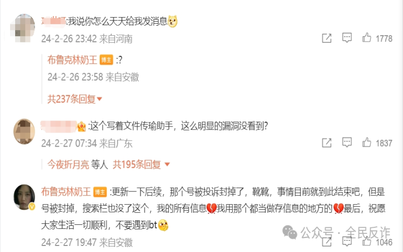 博主發(fā)帖后,在回復網(wǎng)友時告知事情進展,她去報案后,警方?jīng)]受理,隨后她向微信平臺投訴,那個號被封了。“但是號被封掉,搜索欄也沒了,我的所有信息也沒有了”,她說。