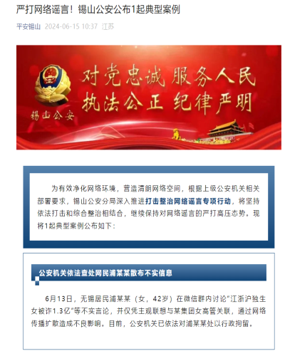 6月15日,江蘇無錫市公安局錫山分局發(fā)布通報稱,無錫居民浦某某(女,42歲)13日在微信群內(nèi)討論“江浙滬獨生女被詐1.3億”等不實言論,并僅憑主觀聯(lián)想,與某集團(tuán)女高管關(guān)聯(lián),通過網(wǎng)絡(luò)傳播擴(kuò)散造成不良影響。目前,公安機(jī)關(guān)已依法對浦某某處以行政拘留。