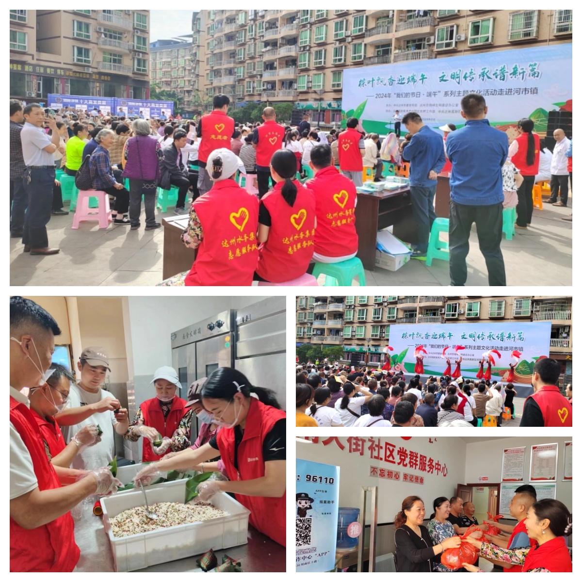 樂在其粽。達(dá)州水務(wù)集團(tuán)高新區(qū)分公司組織志愿者與結(jié)對(duì)聯(lián)創(chuàng)單位——河市南大街社區(qū),在河市鎮(zhèn)中心廣場(chǎng)的“粽葉飄香迎端午 文明傳承譜新篇”系列主題活動(dòng)走進(jìn)河市鎮(zhèn)宣傳活動(dòng),助力結(jié)對(duì)聯(lián)創(chuàng)工作。此外,志愿者們向河市鎮(zhèn)敬老院和社區(qū)困難群眾送上了親手制作的粽子,并送上了美好的祝福。