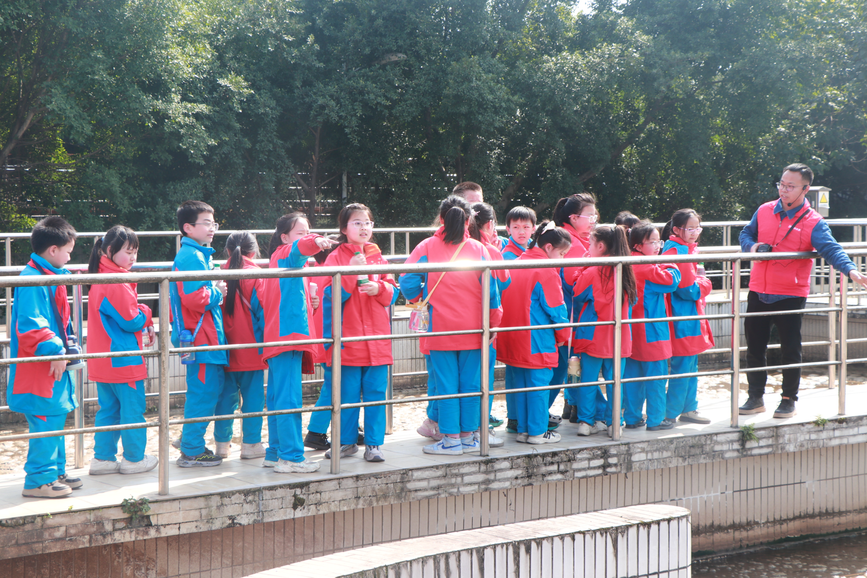 然后的實(shí)地參觀環(huán)節(jié),師生依次走過(guò)生化池、二沉池、出水口等區(qū)域。了解生化池里微生物“吃掉”污染物的神奇過(guò)程,目睹渾濁污水逐步變成清澈水流,對(duì)污水處理的復(fù)雜工藝和神奇效果有了直觀體驗(yàn)。