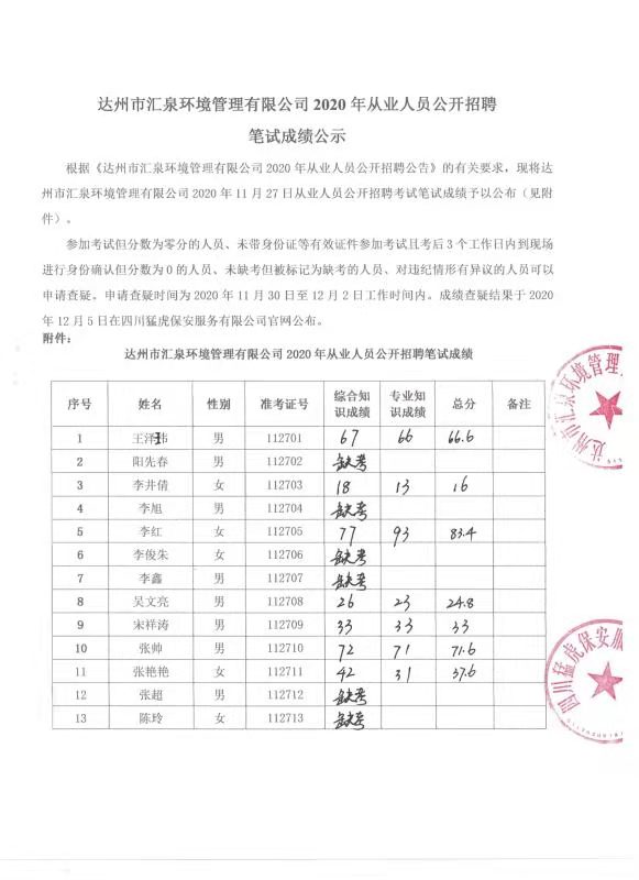 上一篇:達(dá)州市匯泉環(huán)境管理有限公司2020年從業(yè)人員公開(kāi)招聘面試成績(jī)公示